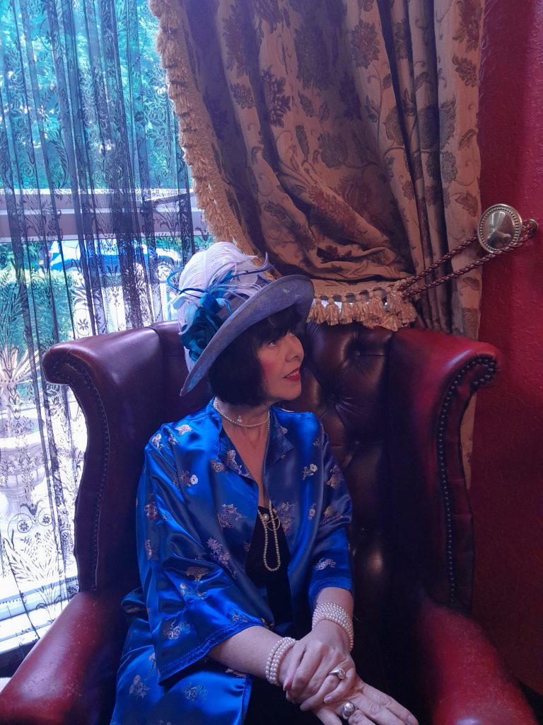 Lindy loves the perfect style of the cloche from the 1920s with her own little twist. Designed with an upturned front brim and straight back (so not to disturb the collar). Lindy also loves the flambouyant featherdecor so loved from the 1920s.