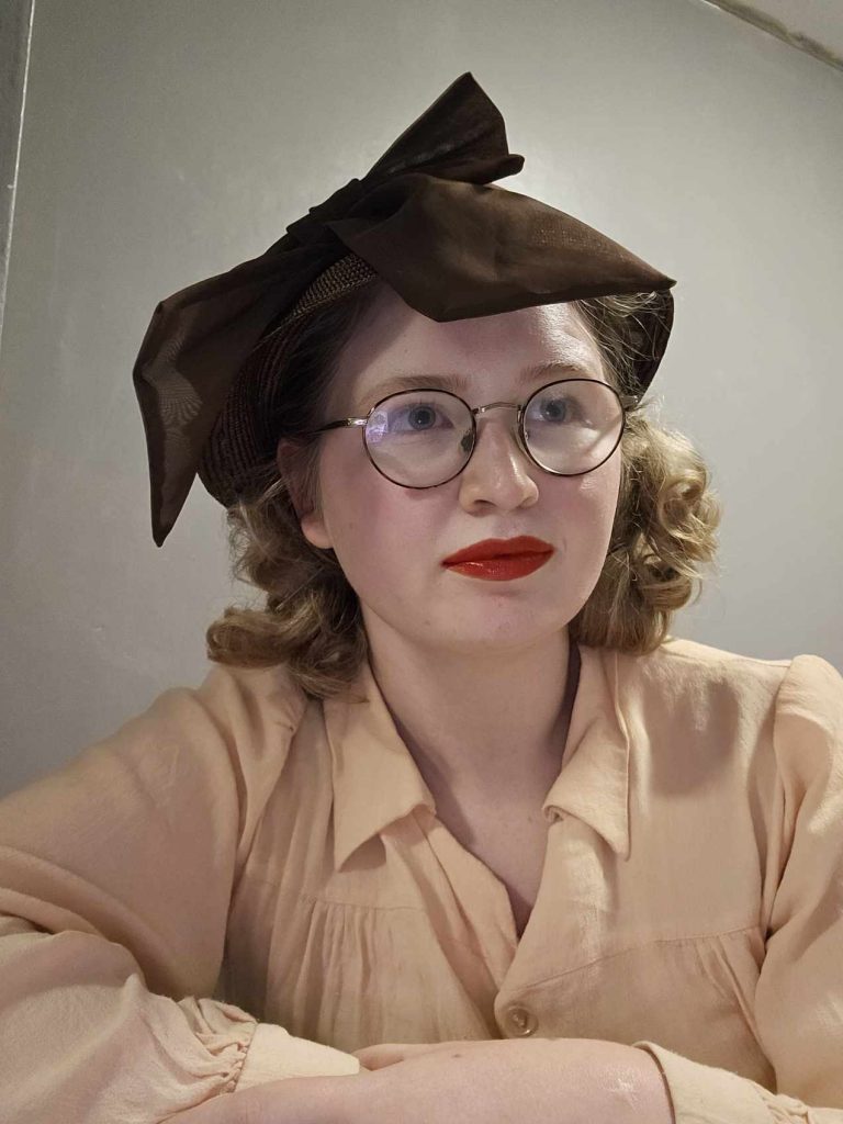 The lovely Brigid is fan of various periods from 1920s throught to the1940s. She fell in love with this 1930s style boater with its double upturned brim. She wanted it to be able to ear with lots of spring and summer outfits so choose a perfect off-white colour and simple matching band with small bow.